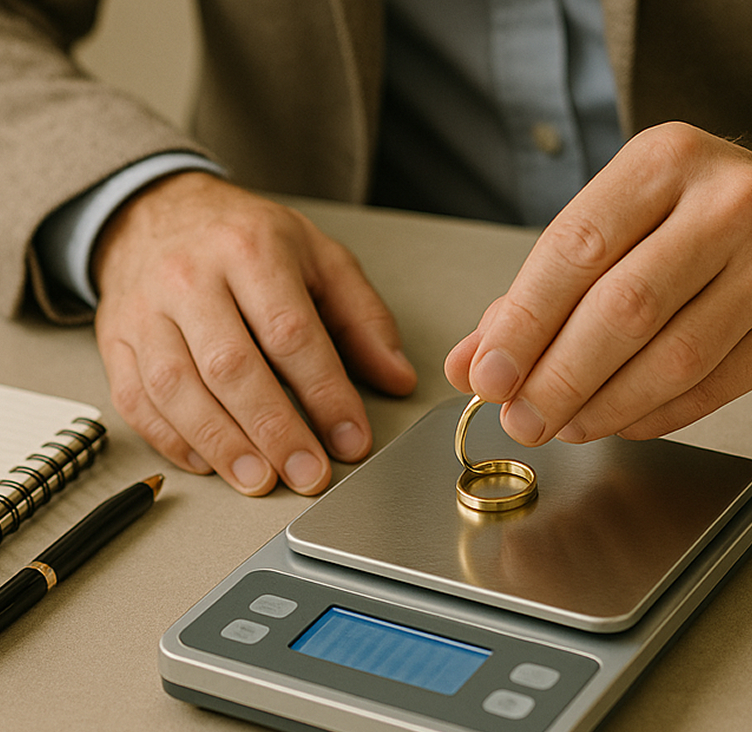 Test et pesée de vos objets en or devant vous. Explication transparente de nos calculs.